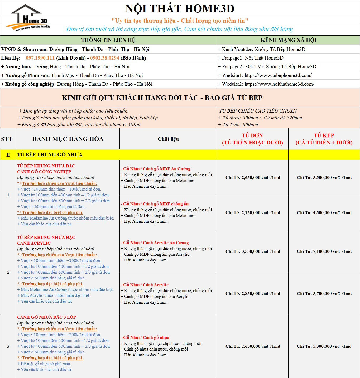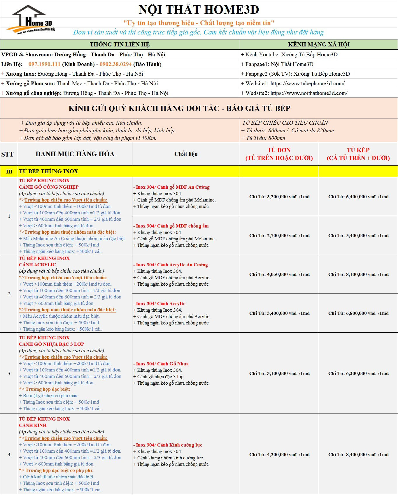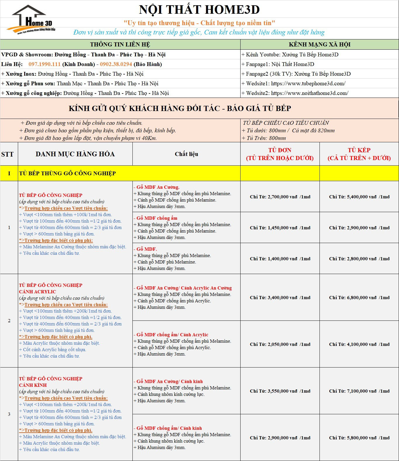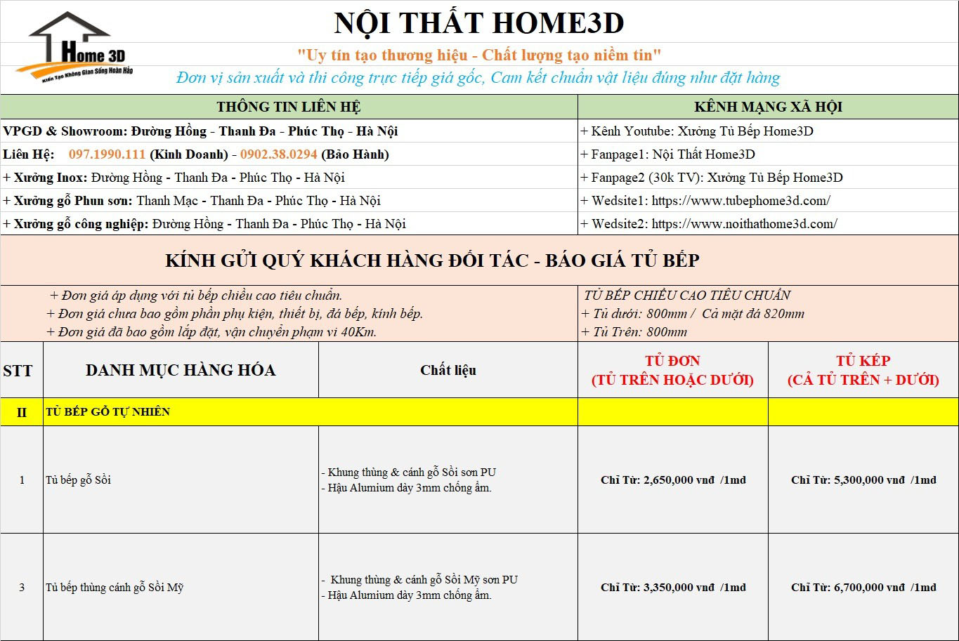 Xưởng Sản Xuất Nội Thất Home 3D Gửi Tới Quý Khách Hàng Báo Giá Tủ Bếp Mới Nhất , Phụ Kiện Cách Tính Chi Phí Các Loại Tủ Bếp Đơn Giản Nhất .